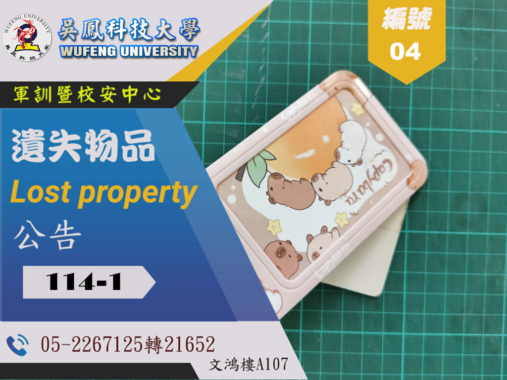114年09月29日拾獲識別證套卡,請至校安中心鄭嘉文處領取,如因故不在則由校安中心其他同仁協助。